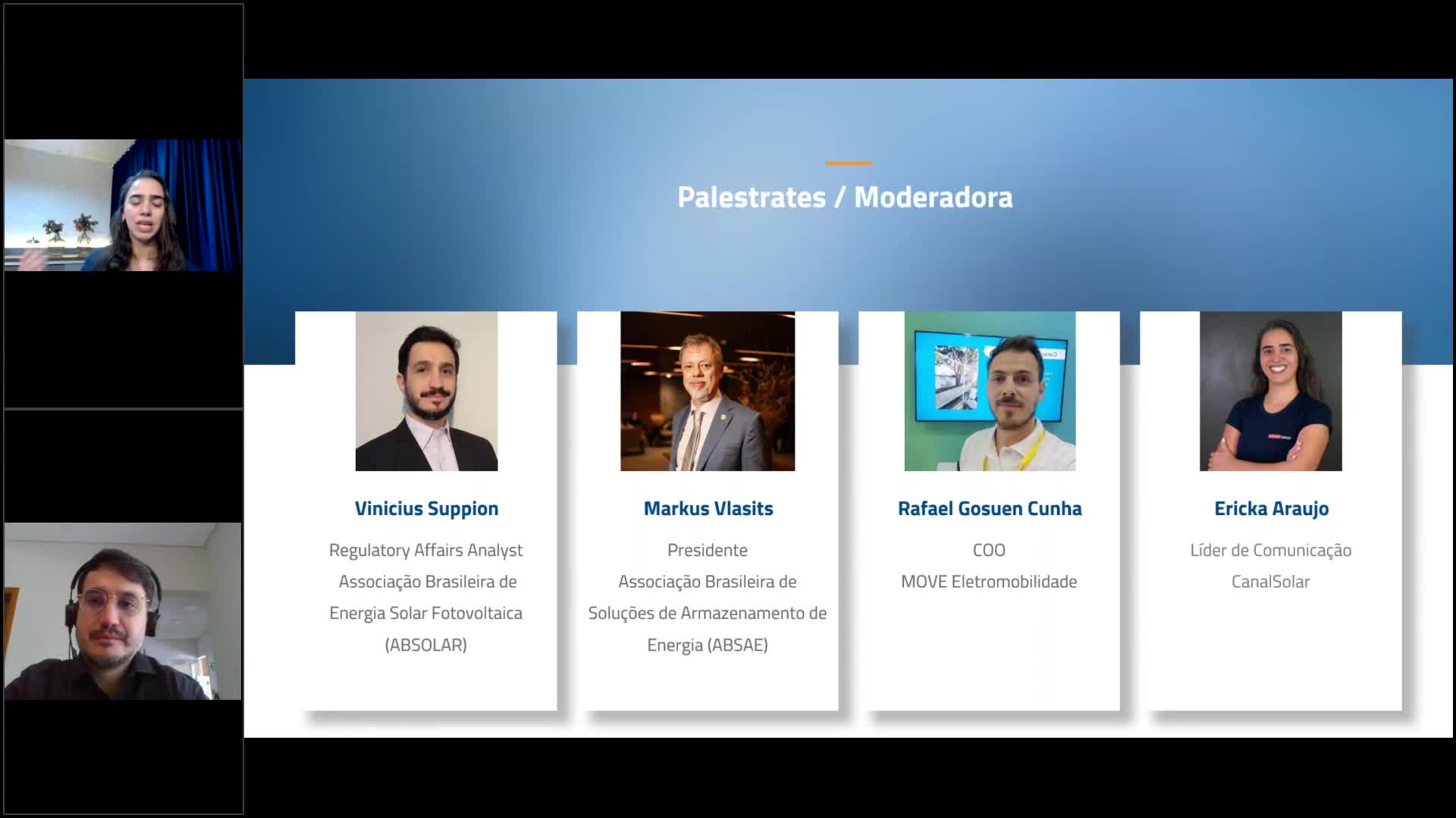 Ericka Araújo é graduada em Jornalismo pela PUC Campinas e atualmente cursa MBA em Administração: Negócios do Setor Elétrico. Ela ocupa o cargo de Líder de Comunicação do Canal Solar e é a host do Papo Solar. Com mais de quatro anos de experiência no mercado de energias renováveis, desde 2020, Ericka tem expertise em produção de podcasts, programas de entrevistas e elaboração de matérias jornalísticas. Em 2019, foi agraciada com o Prêmio Jornalista Tropical pela SBMT e o Prêmio FEAC de Jornalismo.